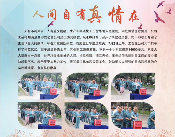 有不測風(fēng)云,人有旦夕禍福。生產(chǎn)車間硫化工王世華愛人患重病,四處籌借醫(yī)療費(fèi)用。公司工會(huì)得知消息立即發(fā)動(dòng)全公司員工為其捐款。6月30日專門召開了捐款動(dòng)員會(huì),向干部職工介紹了王世華愛人的病情,號(hào)召大家踴躍捐款,幫助王世華度過難關(guān)。7月2日上午,工會(huì)在公司大門口舉行了捐款儀式,班子成員身先士萃,其他職工慷慨解囊,不到一個(gè)小時(shí)捐款14000多元。只要人人都獻(xiàn)出一點(diǎn)愛,世界將變成美好的人間。捐款有限,情義無價(jià)。王世華同志接到員工們的愛心捐助感激不盡,表示要更加努力工作,報(bào)答員工兄弟和公司工會(huì),鼓勵(lì)愛人以頑強(qiáng)的意志和樂觀的心態(tài)戰(zhàn)勝病魔,爭取早日康復(fù)。